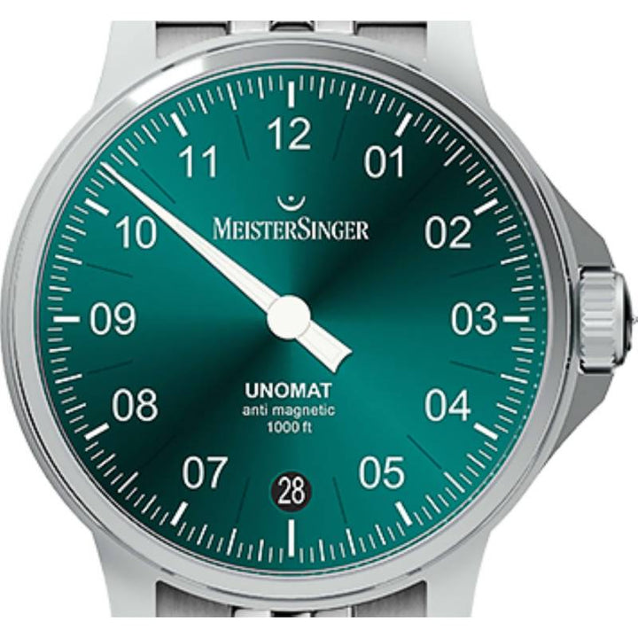 The Unomat 919 is a MeisterSinger watch fitted with a petrol dial with white stick indexes and double digit numerals that glow at night with Super-Luminova coating. It has a large MeisterSinger style hand and a larger date window located at six o'clock.