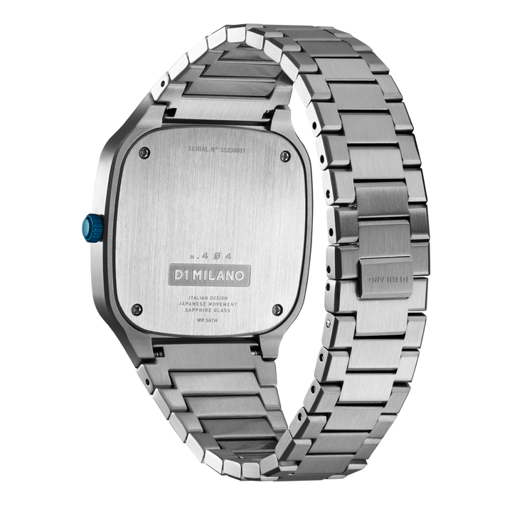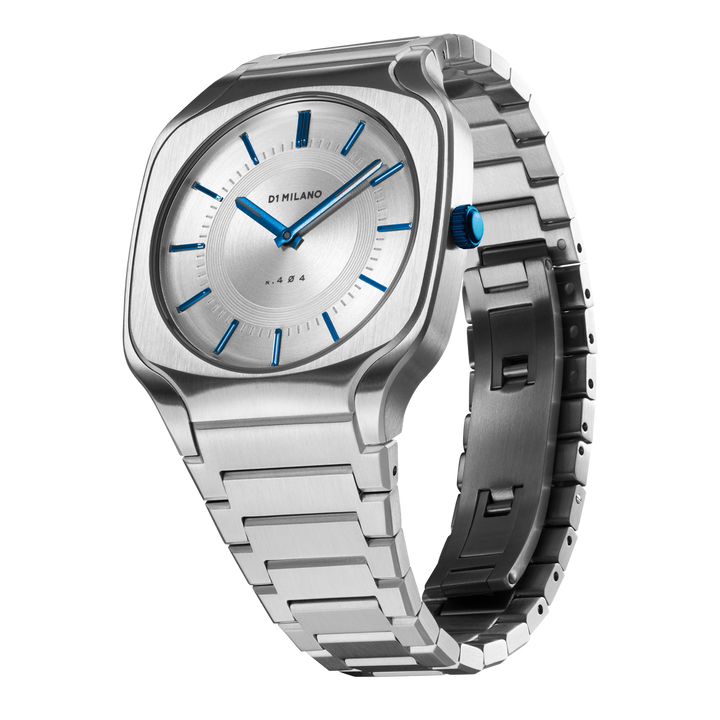 The D1 Milano Square Silver Watch offers a classic combination of looks and luxury. With its bold monochromatic shapes and blue chrome hands and indexes, it inspires a sense of risk and challenge. Its sturdy brushed 316L stainless steel case and sleek bracelet, along with its anti-reflective sapphire crystal, make this a watch that's both durable and dazzling. Go on an adventure and dare to wear the D1 Milano Square Silver Watch!